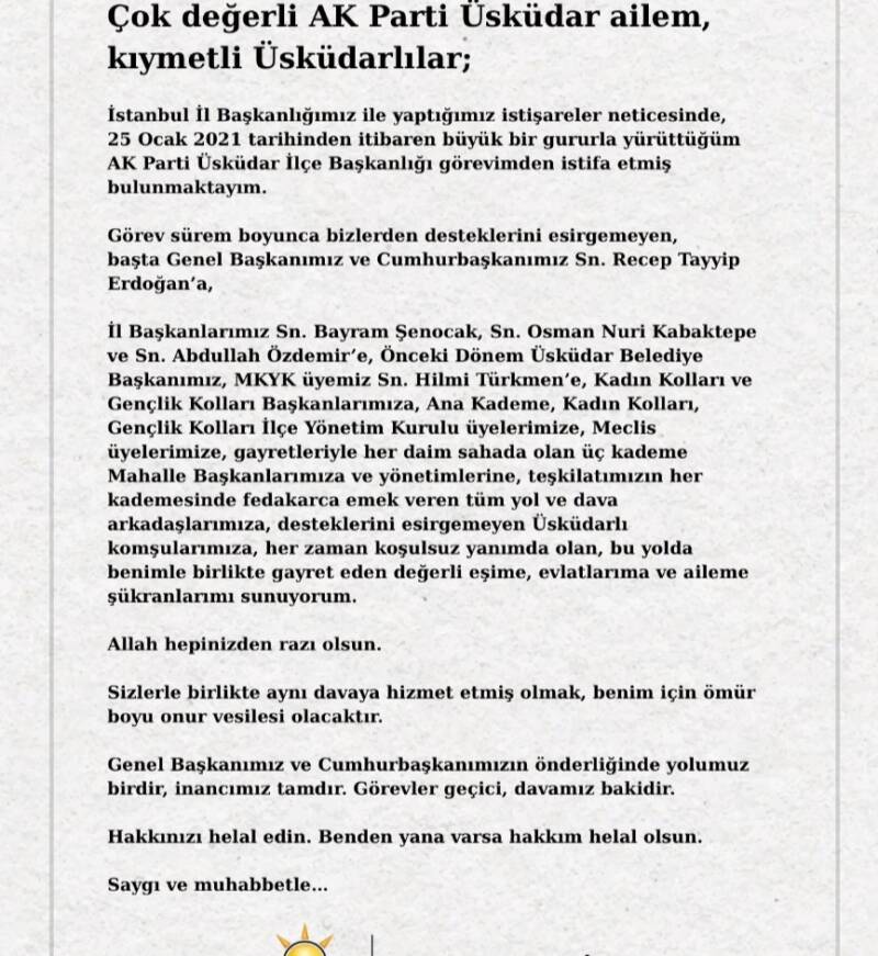 Üsküdar İlçe Başkanı Erdem Demir sosyal medya hesabından görevinden istifa ettiğini açıkladı. Erdem açıklamasında görev süresi boyunca desteklerinden dolayı Genel Başkan ve Cumhurbaşkanı Recep Tayyip Erdoğan’a teşekkür ederken çalışma arkadaşlarından helallik istedi.