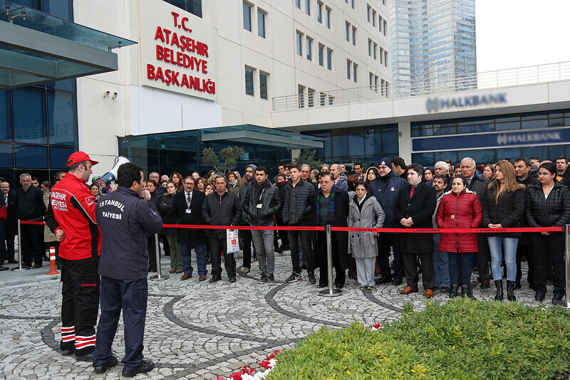 Tatbikatın tahliye kısmında; personel ve vatandaşların binayı boşaltma süresi ölçülürken, ayrıca her katta Ataşehir AKOM tarafından eğitim almış arama kurtarma personeli ile daha önce yangın eğitimi almış personel ve zabıta memurları görev aldı. Belediye binasında yangın alarmı verilerek personelin ve vatandaşın toplanma yerinde buluşması sağlandı.