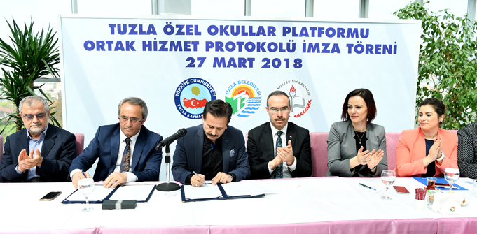 Törende Tuzla Belediye Başkanı Dr. Şadi Yazıcı, Tuzla İlçe Milli Eğitim Müdürü Ahmet Alireisoğlu ve 22 özel okulun temsilcileri ortak hizmet protokolünü imzalayarak Tuzla Özel Okullar Platformu’nun kuruluşunu sağladı.