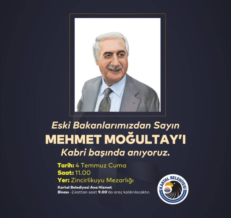 Kartal Belediyesi; avukat, siyasetçi, devlet adamı, Türkiye Büyük Millet Meclisi’nde 18. 19. ve 20. dönemlerinde İstanbul Milletvekilliği, 49. hükümet döneminde Çalışma ve Sosyal Güvenlik Bakanlığı ve 50. hükümet döneminde Adalet Bakanlığı yapmış merhum Mehmet Moğultay için vefatının 8. yılında Zincirlikuyu Mezarlığı’nda bulunan kabri başında bir anma töreni düzenleyecek.