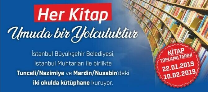 İstanbul Büyükşehir Belediyesi ile İstanbul Muhtarları, Cumhurbaşkanlığı’nın ikinci 100 günlük icraat programında yer alan kütüphane kurulması faaliyetine destek olmak amacıyla kitap toplama kampanyası başlattı. 10 Şubat tarihine kadar sürecek kampanya için vatandaşlar kitap bağışlarını en yakın muhtarlığa teslim edebilecek. Toplanan kitaplar ile İBB tarafından Mardin ve Tunceli’deki 2 okulda kütüphane kurulacak.