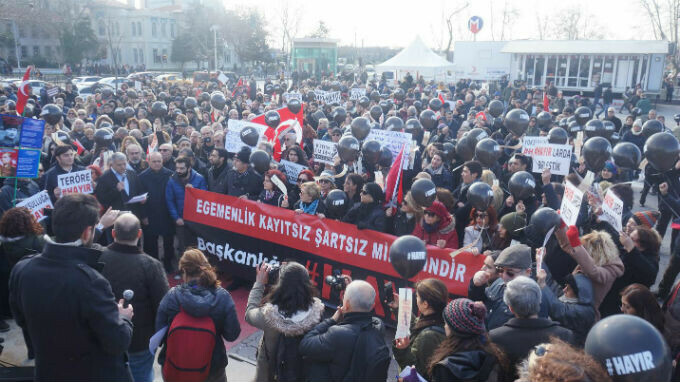 “Egemenlik kayıtsız şartsız milletindir! Başkanlığa HAYIR!” pankartı açılan eylemde, siyah ‘HAYIR’ yazılı balonlar ve ‘Diktatöre HAYIR’, ‘İşsizliğe HAYIR’, ‘Basın özgürlüğü için HAYIR’ yazılı dövizler taşındı.