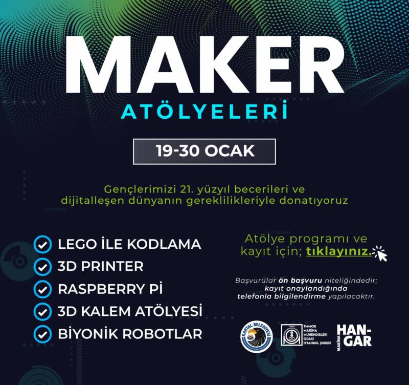Kartal Belediyesi’nin çocuk ve gençlere bilim, mühendislik ve teknoloji alanlarında yenilikçi deneyimler kazandırmak amacıyla düzenlediği Maker Atölyeleri, 19–30 Ocak 2026 tarihleri arasında sömestir dönemine özel olarak Makina Hangar’da gerçekleştirilecek. İlkokul, ortaokul ve lise öğrencilerine yönelik olarak planlanan eğitim programı sayesinde öğrenciler, teknoloji ve üretim temelli uygulamalarla buluşma şansı elde edecek.