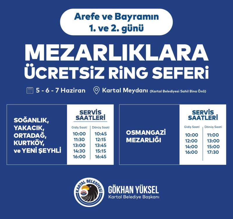 Soğanlık, Yakacık, Ortadağ, Kurtköy ve Yeni Şeyhli’de bulunan mezarlıklara yakınlarının kabirlerini ziyaret etmek isteyen vatandaşlar için, Kartal Meydanı’ndan (Kartal Belediyesi Sahil Hizmet binası önü) servisler hareket edecek. 5-6-7 Haziran tarihlerinde yapılacak olan ücretsiz seferler ile vatandaşlar sevdiklerinin ebedi istirahatgahına ulaştırılacak. 3 gün boyunca yapılacak ring servisleri ile vatandaşlara ulaşım desteği sunulmuş olacak.