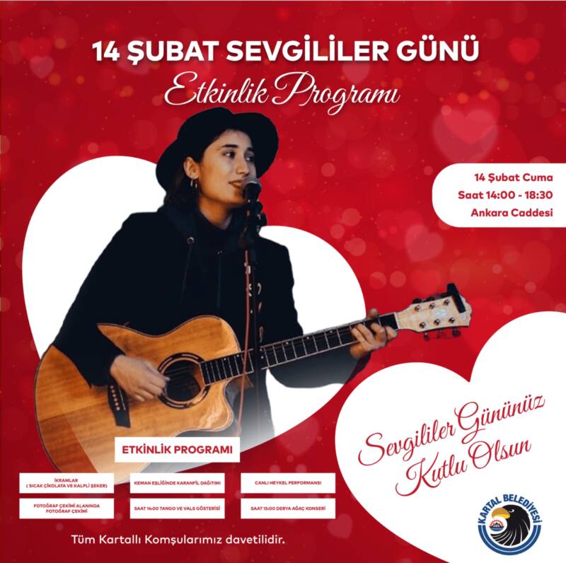 Kartal Belediyesi Kültür ve Sosyal İşler Müdürlüğü’nün her yıl 14 Şubat’ta düzenlediği ‘Sevgililer Günü’ programı ise saat 14.00-18.30 arasında Ankara Caddesinde yapılacak. Mini konser, tango ve vals gösterimi, karanfil dağıtımı, canlı heykel performansı ve fotoğraf çekiminin yapılacağı Ankara Caddesi’nde sevgi fırtınası yaşanacak. Saat 15.00’de ise Derya Ağaç konseri ile sevgililer günü etkinlikleri devam edecek.
