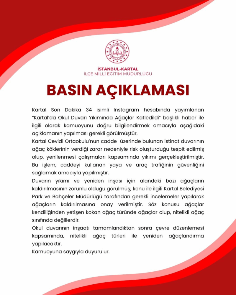 Kartal Son Dakika 34 isimli Instagram hesabında yayımlanan “Kartal’da Okul Duvarı Yıkımında Ağaçlar Katledildi” başlıklı haber ile ilgili olarak kamuoyunu doğru bilgilendirmek amacıyla aşağıdaki açıklamanın yapılması gerekli görülmüştür.