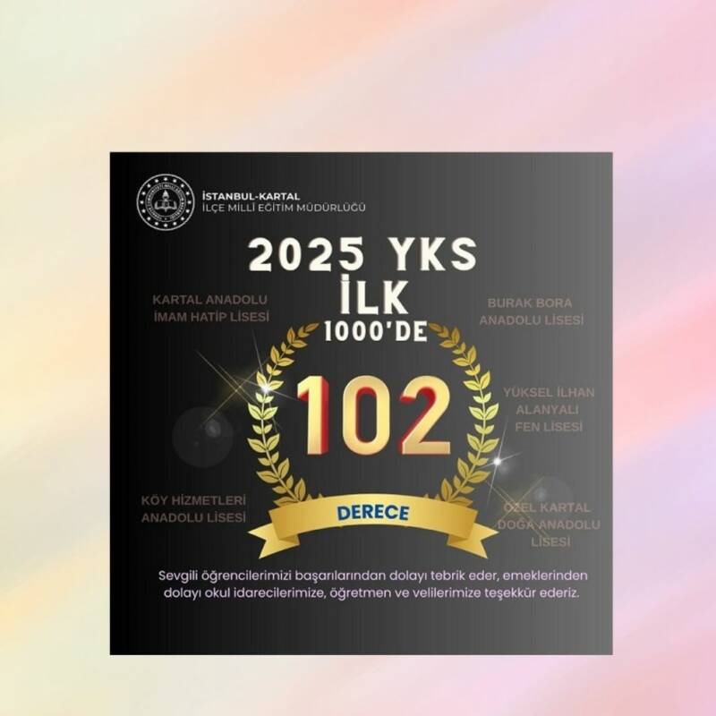 2025 Yükseköğretim Kurumları Sınavı (YKS) sonuçlarına göre Kartal’daki okullardan sınava katılan öğrencilerimiz önemli başarılar elde etti. İlçemizden 26 öğrenci Türkiye genelinde ilk 100’e, 102 öğrenci ise ilk 1000’e girerek bizleri sevindirdi.