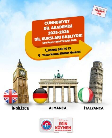 İngilizce, Almanca ve İtalyanca dillerinde A1 ve A2 seviyelerinde açılacak kurslar için kayıtlar, 8-19 Eylül 2025 tarihleri arasında alınmakta olup, kayıt işlemleri ve kurslar, Yaşar Kemal Kültür Merkezi’nde gerçekleştiriliyor. 12 hafta sürecek olan eğitimler, kontenjanla sınırlı olacak.