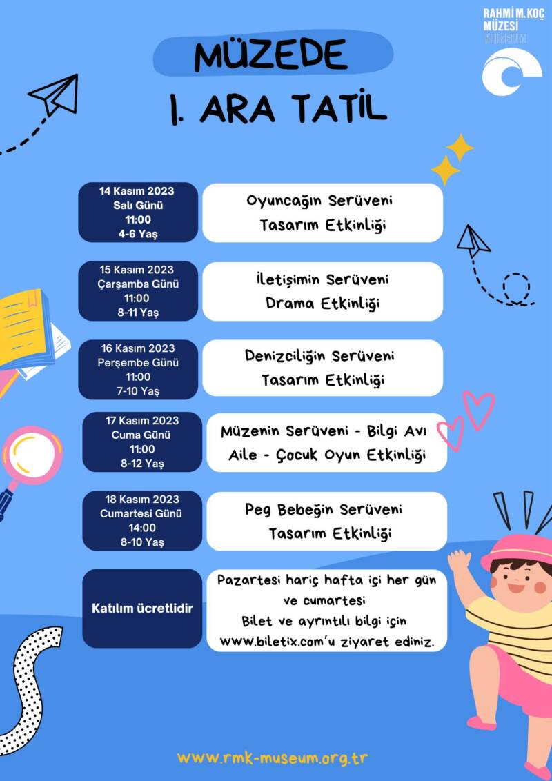Rahmi M. Koç Müzesi, ara tatil boyunca çocuklar için her gün farklı bir etkinliğe ev sahipliği yapıyor. Müze eğitmenleri eşliğinde gerçekleştirilecek etkinliklerde, 4-12 yaş arası çocuklar bilim, sanat, teknoloji, tasarım içerikli macera dolu yolculuklara çıkacak.