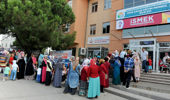 Tuzla Belediyesi’nin anne ve 3-6 yaş aralığındaki çocuğunu eğitimde aynı çatı altında buluşturan ve ücretsiz hizmet veren Anne Çocuk Eğitim Merkezi’nin (AÇEM) yeni dönem kayıtları yoğun ilgi gördü. Mimar Sinan, Şifa ve Aydınlı şubelerinde yıllık kontenjan ilk gün doldu, merkezlerde yedek kayıtlar alınmaya başlandı. Emlak Konut, Yayla ve Orhanlı şubelerinde ise kayıtlar büyük oranda doldu. Tuzla Belediyesi’nin kendileri ve 3-6 yaş grubundaki çocukları için sunduğu fırsattan yararlanmak isteyen anneler, kayıt merkezlerinin dışına taşan kuyrukta sıra bekledi. 2014 yılında faaliyete başlayan Tuzla Belediyesi Anne Çocuk Eğitim Merkezi, bu yıl 1200 anne ve 1200 çocuğa 6 bölgede hizmet verecek. 3. eğitim yılına merhaba diyecek olan AÇEM’de kursiyer anne ve çocukları eğitim, etkinlik, seminerler ve kişisel gelişimlerine faydalı faaliyetler bekliyor. Tuzla Belediyesi Anne Çocuk Eğitim Merkezi (AÇEM), verdiği eğitim hizmeti ile komşu ilçelerden de kayıt talepleri alıyor.
