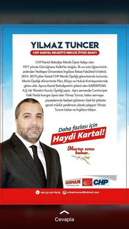 31 Mart yerel seçimleri Kartal’da CHP’sinin zaferi ile sonuçlandı. Bu başarı tabi ki tek başına kazanılmadı, süreçte Başkan adayları Gökhan Yüksel’e destek veren,yanında olan isimler vardı. Bu isimlerin Başında genç ama bir o kadar da deneyimli siyasetçilerden Yılmaz Tuncer’i sizlere tanıtalım istedik.